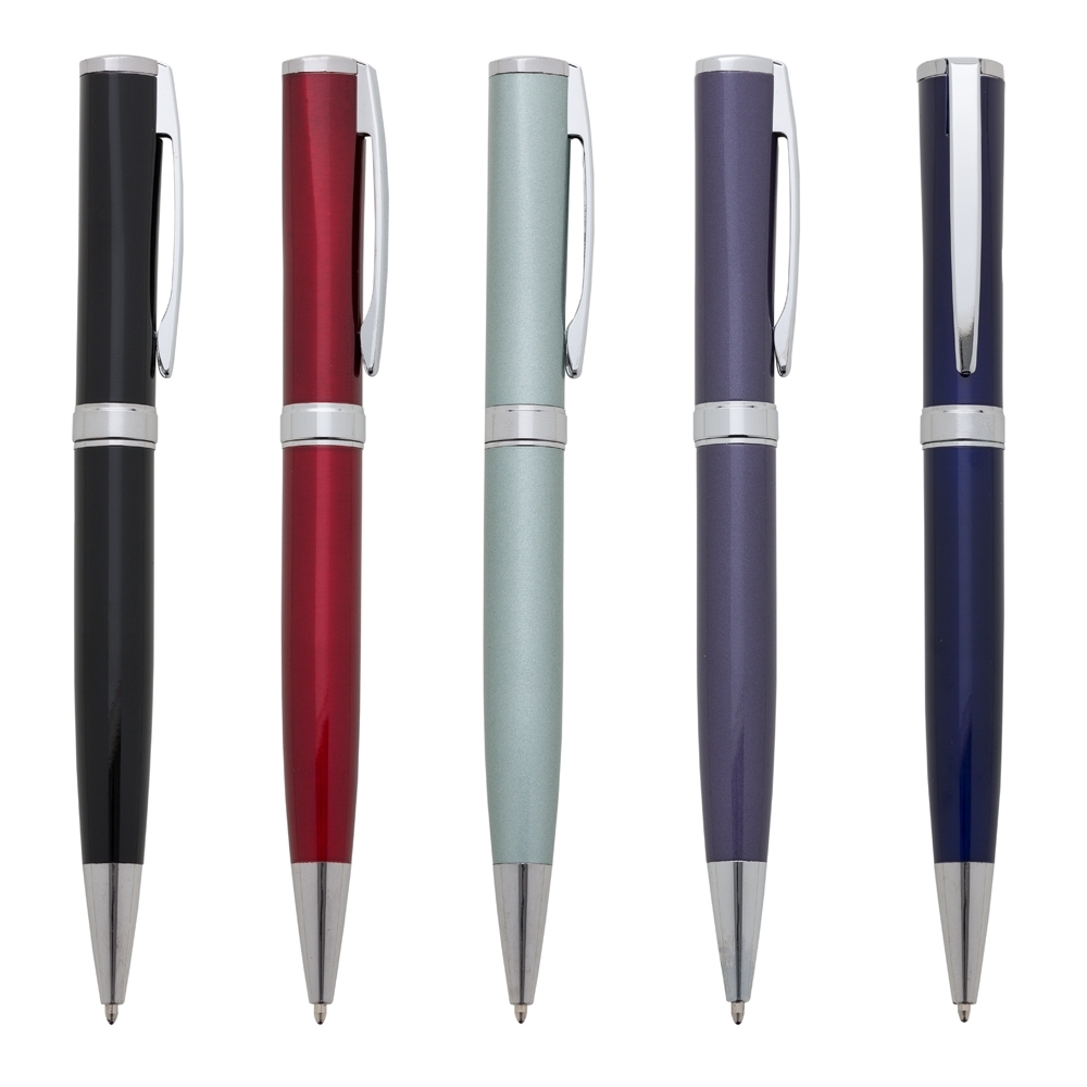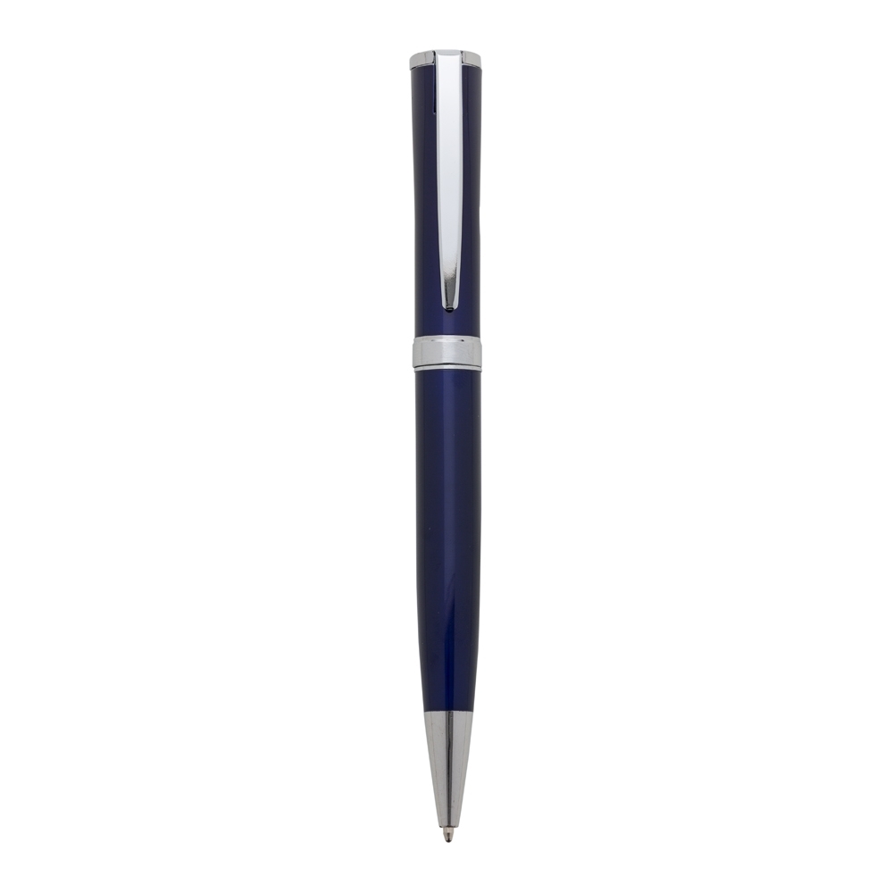Descrição: Caneta metálica com carga esferográfica azul 1.0 mm e acionamento por rotação.