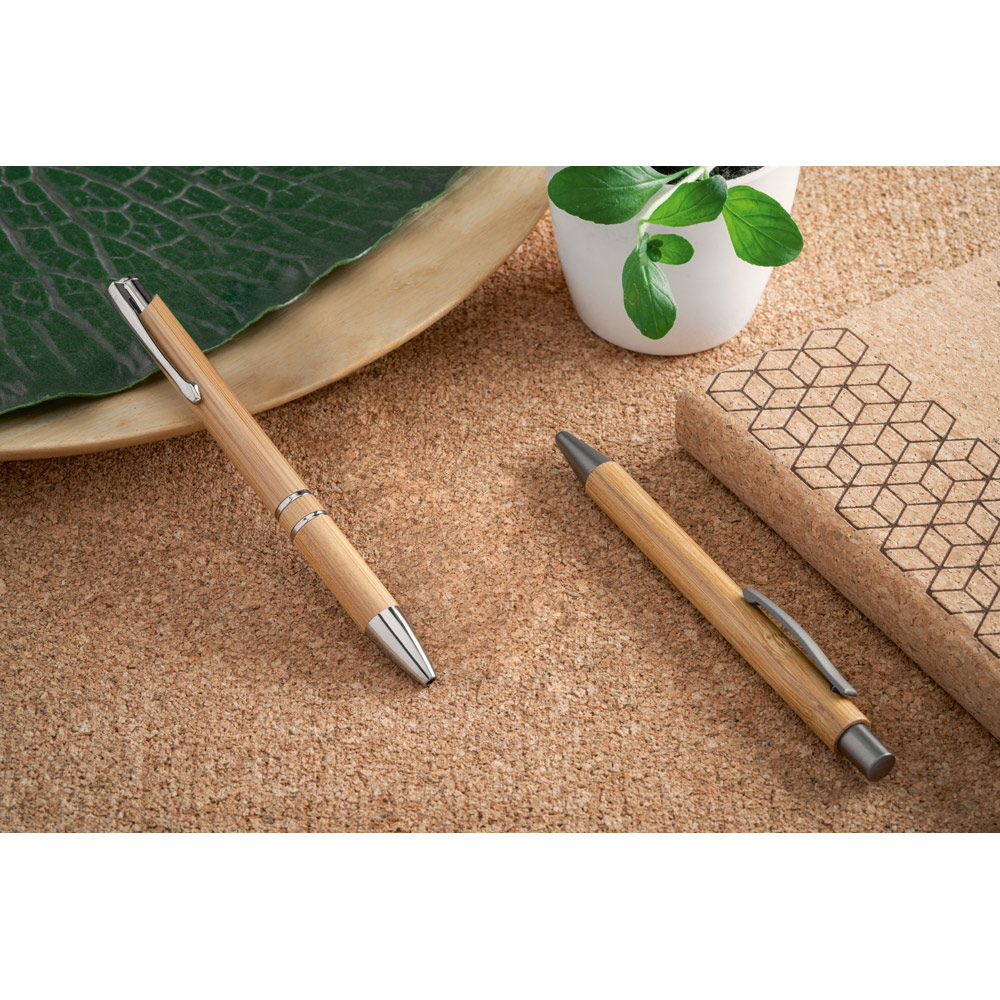 Esferográfica em bambu com clipe de metal. Até 1,5 km de escrita. Escrita em azul. A cor e o resultado da impressão nos materiais naturais pode variar entre produtos. ø11 x 141 mm
