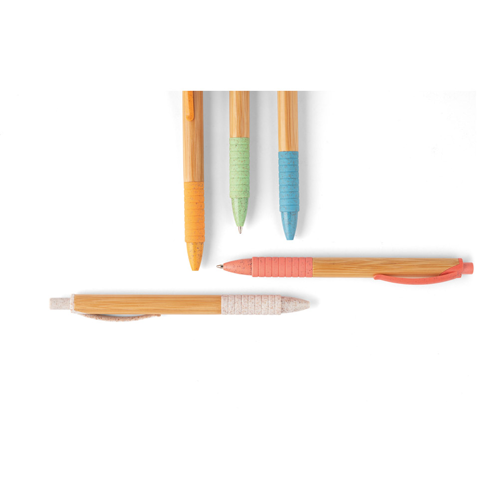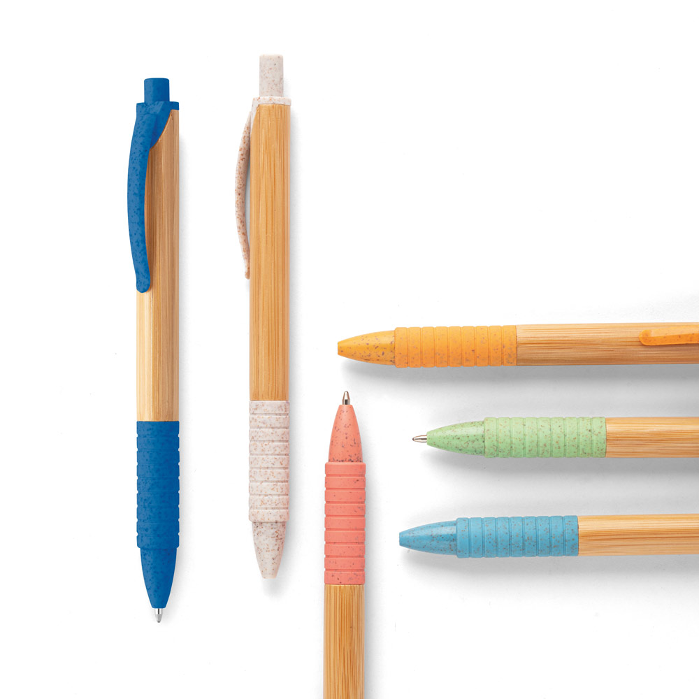 Esferográfica em bambu com clipe, antideslizante e elementos coloridos em fibra de trigo e ABS. Até 1,5 km de escrita. Escrita em azul. A cor e o resultado da impressão nos materiais naturais pode variar entre produtos. ø11 x 142 mm