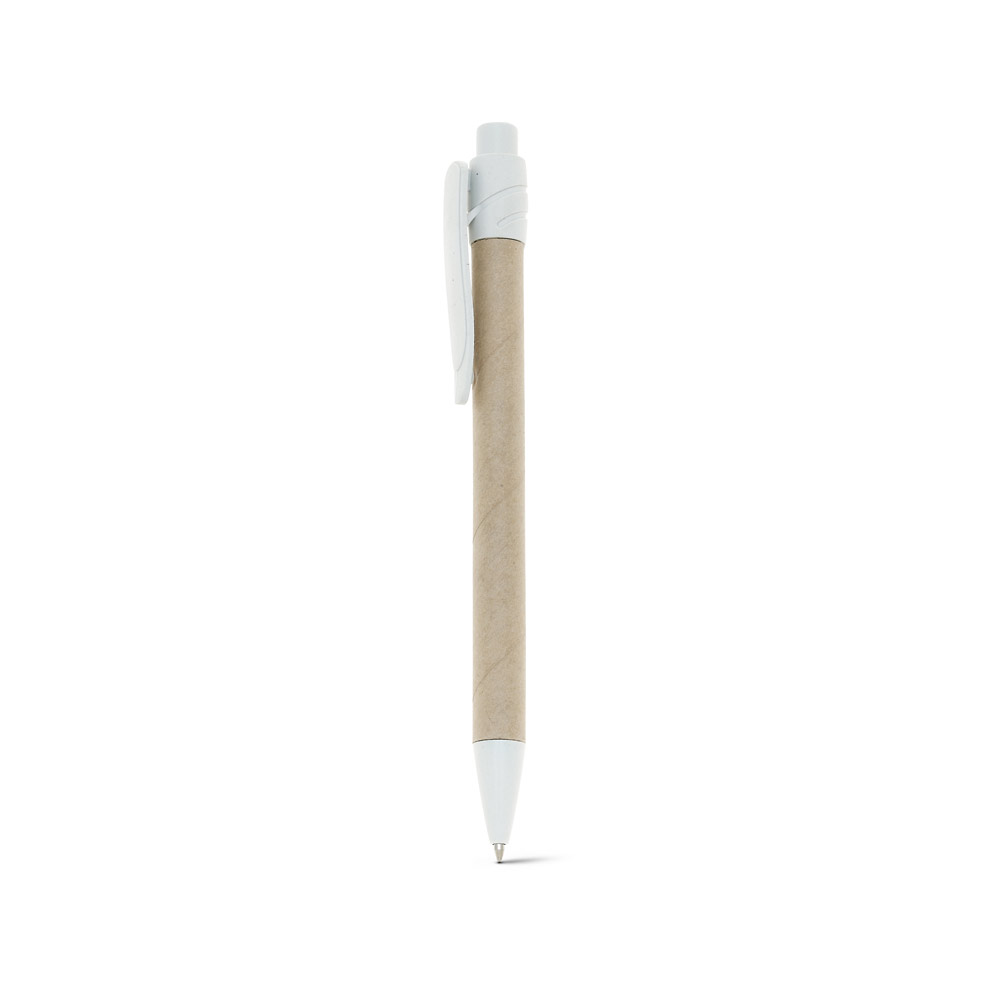 Esferográfica em papel kraft reciclado, com clipe de plástico. Escrita em azul até 1,5 km. A cor e o resultado da impressão nos materiais naturais pode variar entre produtos. ø10 x 140 mm